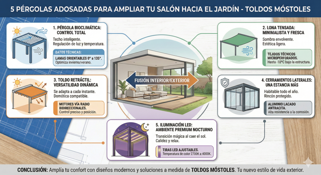 Convertir el salón en un espacio que se funde con el exterior es uno de los deseos más habituales en los hogares actuales. Las pérgolas adosadas permiten precisamente eso: ganar metros útiles, mejorar el confort y crear una transición elegante entre interior y jardín. A continuación encontrarás cinco ideas profesionales que combinan diseño, emoción y detalles técnicos para ayudarte a imaginar cómo sería ampliar tu salón sin obra compleja.