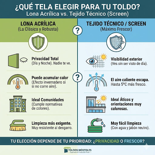 En Toldos Móstoles vemos este dilema a diario. Elegir mal la tela puede hacer que tu terraza siga siendo un horno o que pierdas la privacidad que buscabas.