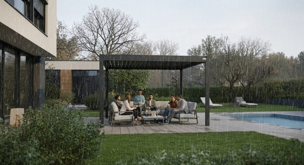 Un café mientras escuchas la lluvia caer o una comida con amigos bajo una suave brisa. Bajo tu pérgola, cada estación tiene su encanto.