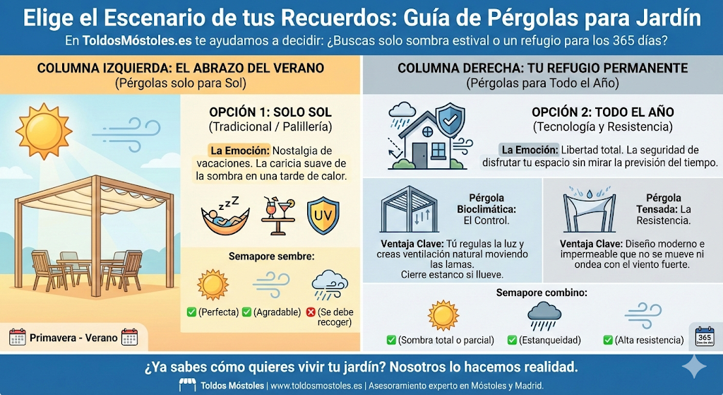 En Toldos Móstoles, sabemos que cada hogar es un mundo y cada familia tiene una forma diferente de sentir el exterior. Por eso, elegir una pérgola para el jardín no es solo una cuestión de «dar sombra», es una decisión sobre cómo quieres vivir tu tiempo libre.