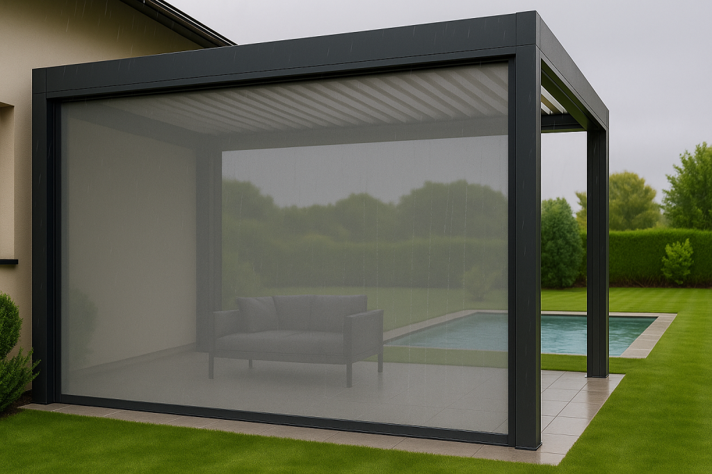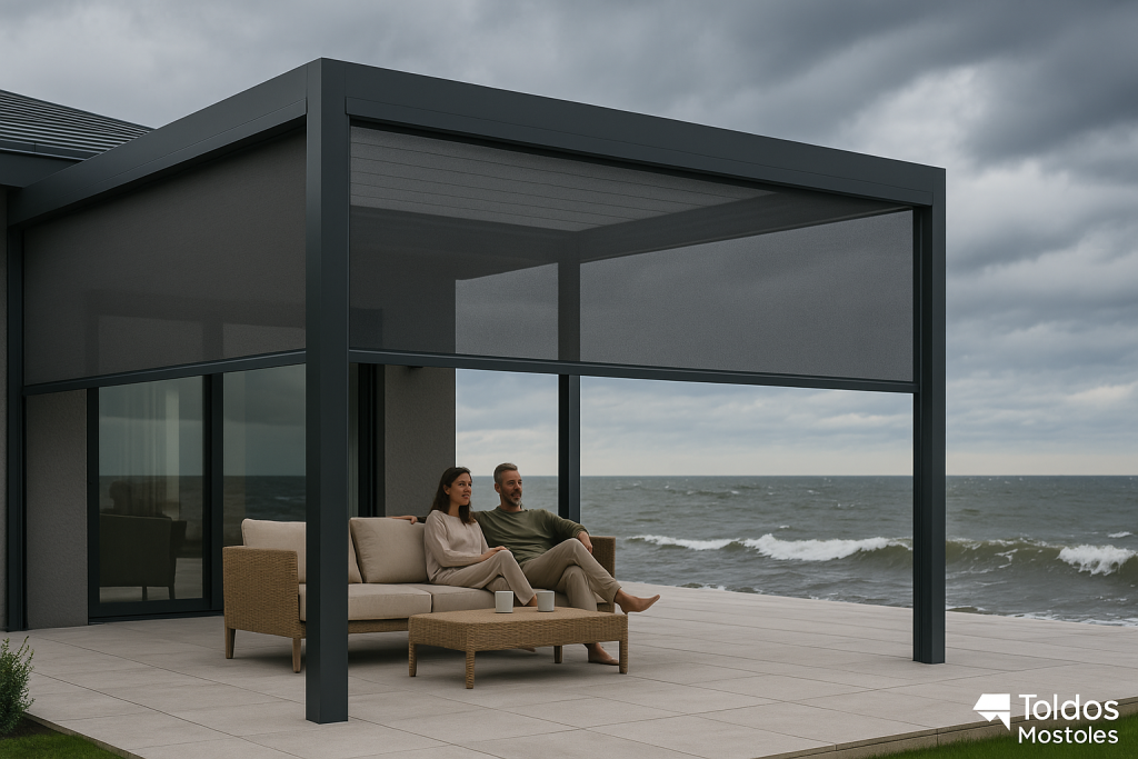 El combo ganador es screen o acrílico + guías ZIP en los laterales. Obtienes una especie de “cuarto flexible”: se abre en segundos, se cierra cuando el tiempo se pone tonto. Ideal para toldos verticales cortavientos para pérgolas.